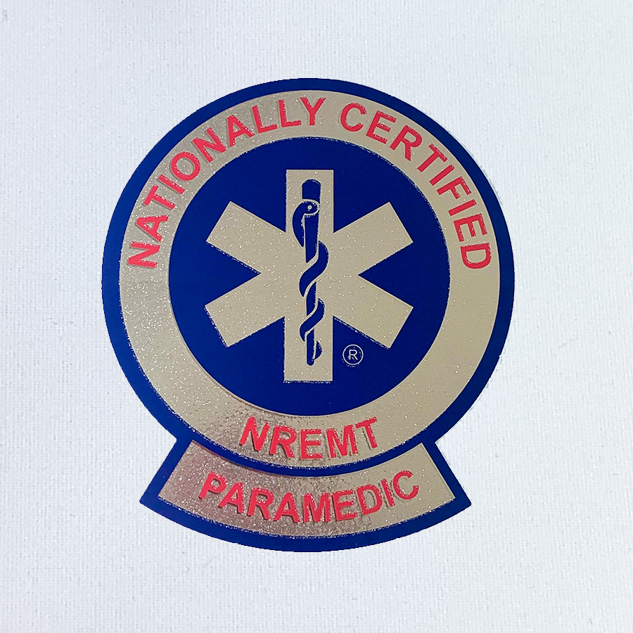 Official Paramedic decal of the National Registry of EMTs; blue, white, and red 3.5" peel-off sticker with Star of Life